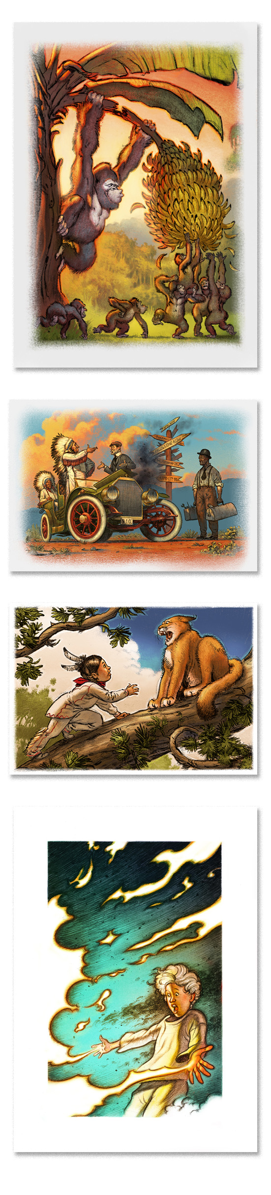 Whether he is telling the story of Paul Bunyan and Babe, teaching a donkey to play the flute, or sharing animals doing tai chi in the forest, every detail included in any illustration by DAVID MOORE adds to the WOW factor and humorous wit in the tales for children of all ages. Playing with light, color, and subtle hits of hysterical whimsy, Moore is a natural go to for children's picture books of all kinds.