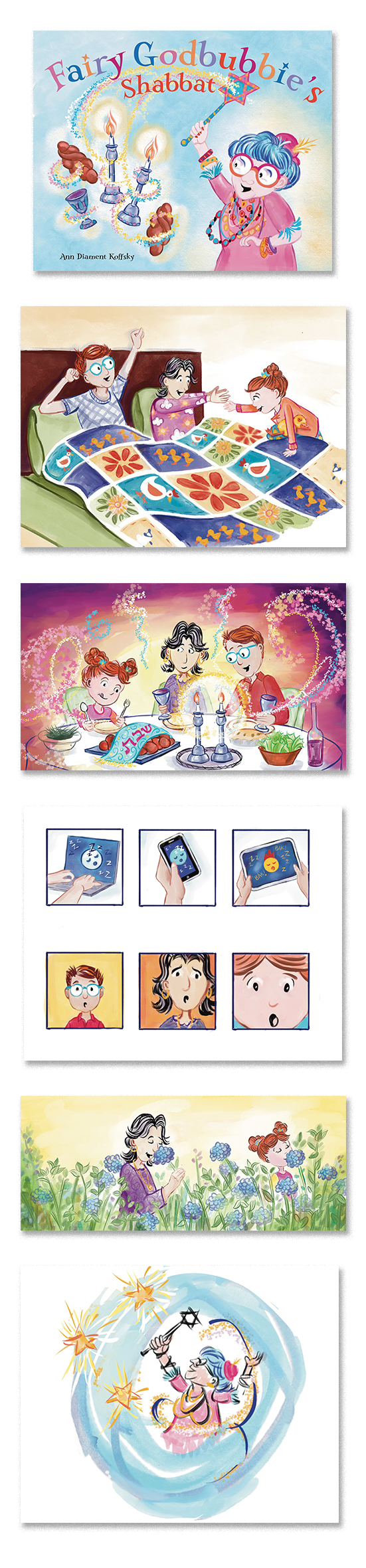 In this newest book from author/illustrator ANN KOFFSKY, the Fairy Godbubbie comes to visit the Mazel House. Lo’ and behold, as she arrives, all of the screens lose power... and they all experience a peaceful, beautiful, and ever present magical Shabbat. Koffsky shares with us all, how putting down our screens and eating a nice meal, playing a game, or taking a walk outside is where the magic is, together. This one is a gem and will have you unplugging and reconnecting in a modern, relatable way that the kinder will understand and appreciate.